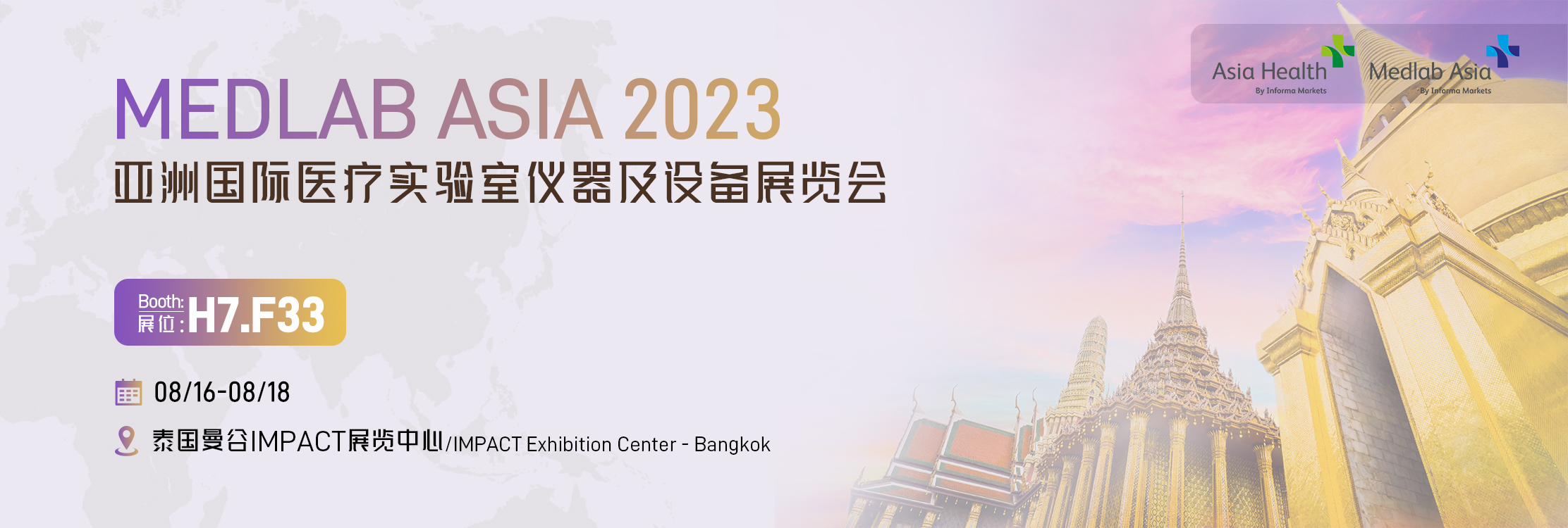2023年8月16-18日,亚洲国际医疗实验室仪器及设备展览会(Medlab Asia & Asia Health)将在泰国曼谷Impact展览中心召开。作为亚洲地区最具影响力的医疗盛会,Medlab Asia为医学和实验室专业人士提供了一个独特的平台,预计今年将有7500多名专业人员参会,包括来自亚洲各地的代表、业内专家、经销商和实验室高管等。