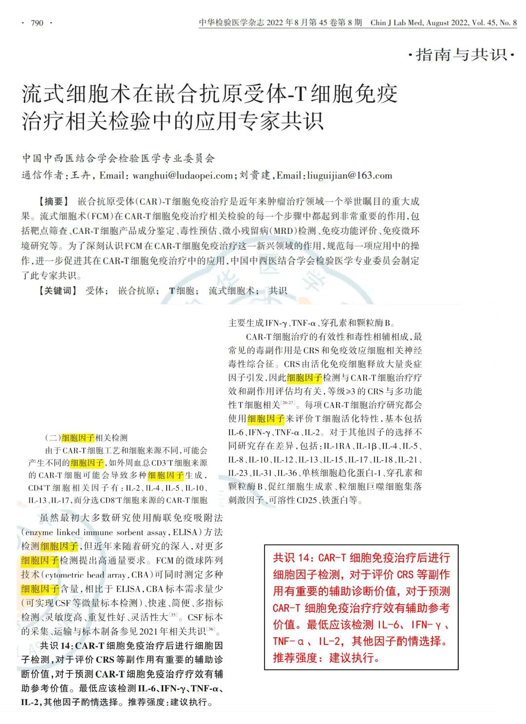 2022年,《流式细胞术在嵌合抗原受体-T细胞免疫治疗相关检验中的应用专家共识》[2]发布, 该共识对细胞因子检测做了详细的表述,并在共识14中指出:“CAR-T细胞免疫治疗后进行细胞因子检测,对于评价CRS等副作用有重要的辅助诊断价值,对于预测CAR-T细胞免疫治疗疗效有辅助参考价值。最低应该检测IL-6、IFN-γ、TNF-α、IL-2,其他因子酌情选择。推荐强度:建议执行。