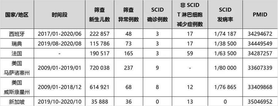 2021年,有来自6个国家/地区的研究人员报道了他们的新生儿SCID筛查的阶段性结果,包括西班牙、瑞典、法国、美国马萨诸塞州和威斯康星州以及新加坡。SCID发病率从1/80 000至1/38 500不等,无明确漏检病例报道。除SCID外,这些筛查项目还意外发现了许多非SCID的综合征型T淋巴细胞减少症病例,如22q11.2缺失综合征、软骨-毛发发育不良综合征及CHARGE综合征等。